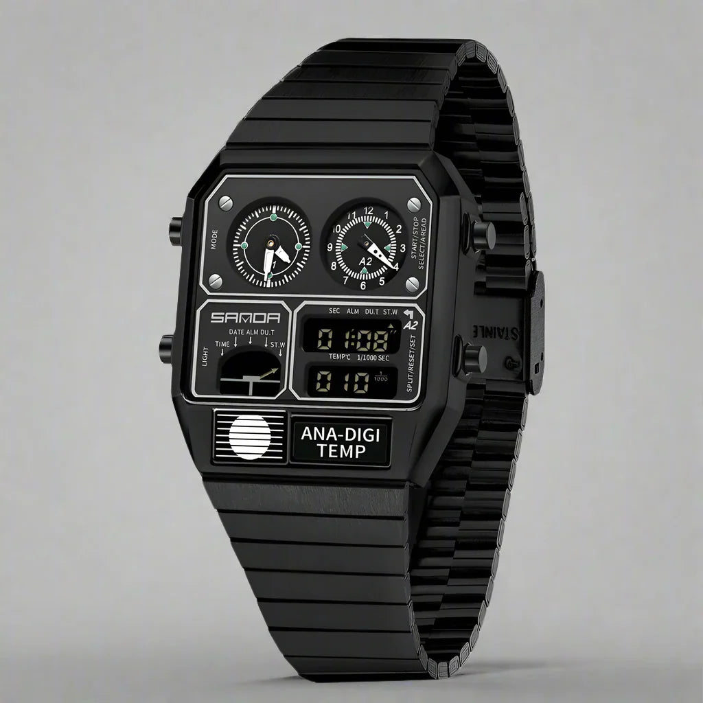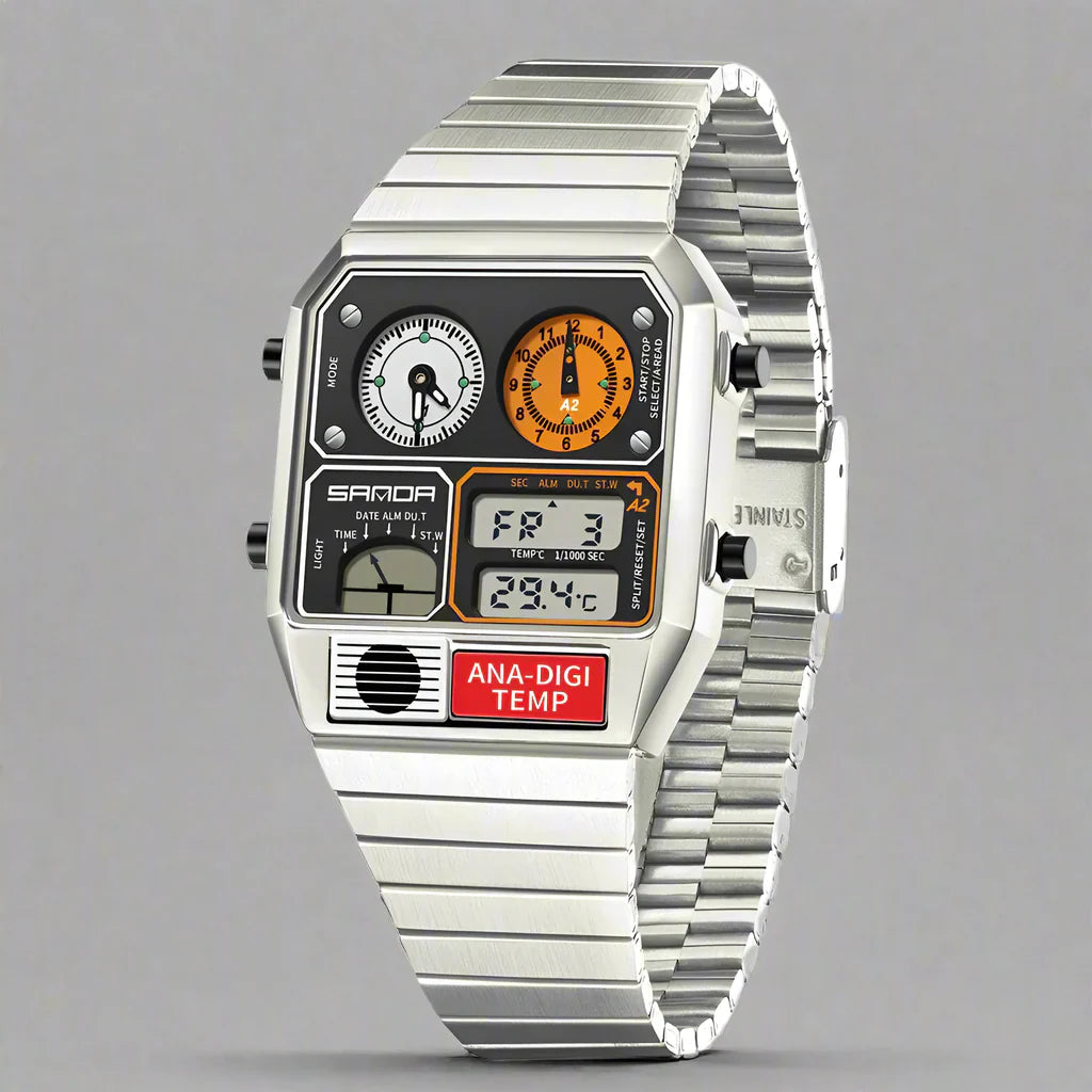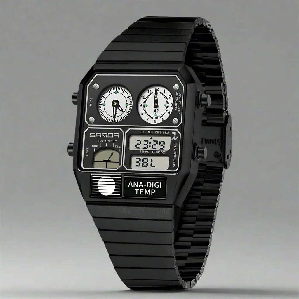Blend retro aesthetics with modern technology in this distinctive dual-display watch. The geometric case design houses both analog and digital functions within a sophisticated interface, while the precision-engineered metal bracelet offers seamless comfort for daily wear.