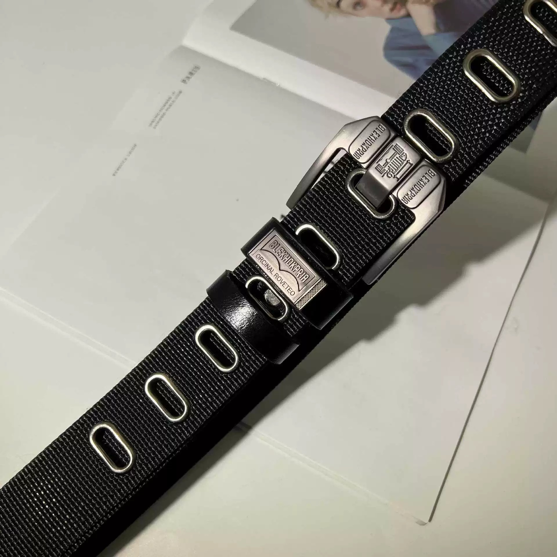 • Reinforced nylon construction with leather keeper • Quick-release industrial metal buckle • Precision-woven pattern with contrast edging